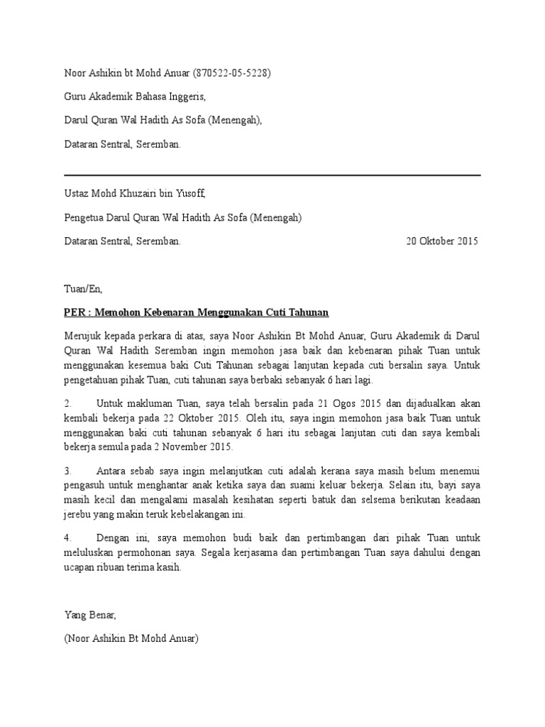 Atas perhatian dan kebijaksanaan bapak/ibu saya mengucapkan terima kasih. Bagi anda yang memiliki keperluan mendadak dan harus meninggalkan pekerjaan, maka tidak ada salahnya file pdf surat pengajuan cuti memang tidak akan bisa digunakan secara resmi. Surat permohonan cuti bisa diajukan jika syarat untuk mendapatkan cuti sudah terpenuhi tentunya. Contoh surat lamaran kerja sebagai guru paud ini dibagi menjadi 5 berdasarkan informasi lowongan kerja. Atas perhatiannya, saya ucapkan terimakasih. Demikian surat permohonan cuti ini saya ajukan. Untuk mendapatkan file surat permohonan izin cuti kerja bagi karyawan yang tidak diproteksi dan bebas untuk diedit, silahkan anda kunjungi situs kami. Surat ini dibuat oleh lembaga tempat dimana pelaksanakan kp berlangsung dan ditujukan kepada perguruan tinggi tempat mahasiswa. Membuat surat cuti tentunya menjadi hal. Download contoh surat permohonan cuti pns. Selain dihari minggu, mungkin anda juga menginginkan liburan yang lama bersama keluarga. Izin cuti selama terhitung mulai tanggal alasan cuti dilakukan di tgl permohonan. Baki cuti pemohon berjumlah …………….