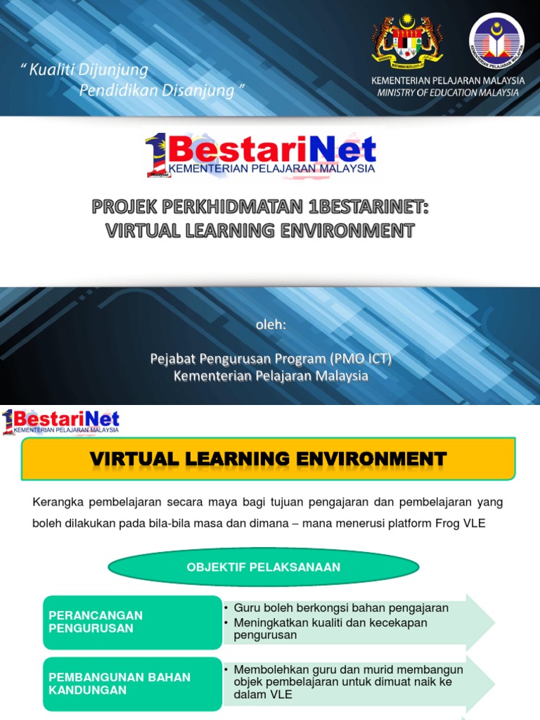 Program persekitaran pembelajaran maya (frog vle) telah dibekalkan oleh 1bestari net ke semua sekolah kerajaan baik sekolah rendah.