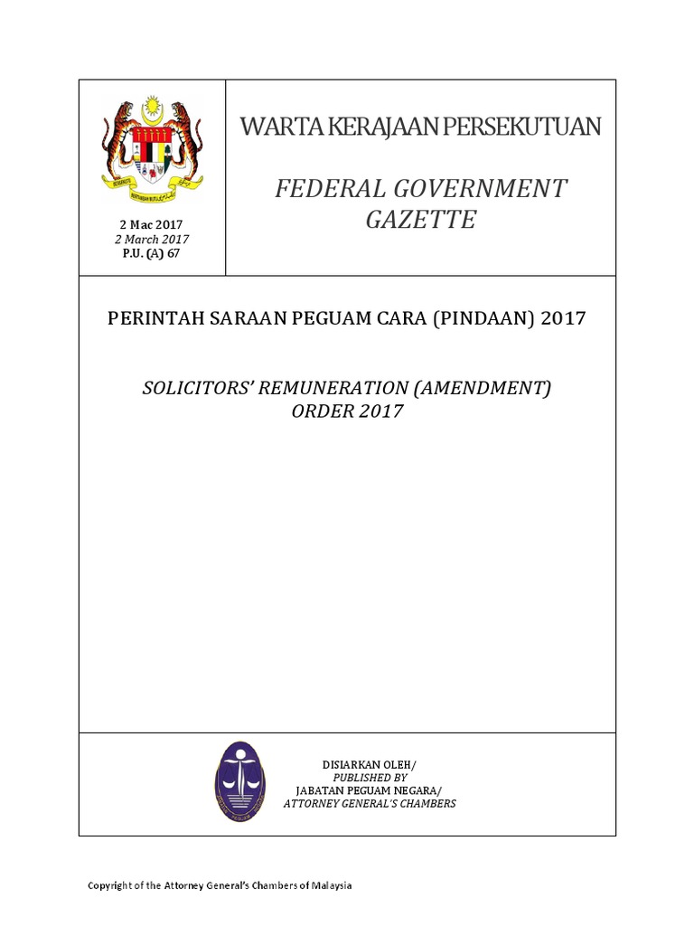 Notwithstanding the revocation of the legal profession (solicitors' remuneration) order (o 1, 1996 ed.), that order shall continue to apply to any business for which. While lots of things were increased in recent months, property price in malaysia still considerable cheap compare to the neighboring country, singapore. The scale fees are as follow Fast and free shipping free returns cash on delivery available on eligible purchase. Having a lawyer by your side is also an added assurance in case anything with legal jargon crops up, or you're in need of urgent legal advice. Solicitors' remuneration order 2006 comes into operation on 1 january 2006. Datuk roger tan kor mee advocate and solicitor. These amendments to order 6, the first schedule and the third schedule of the solicitors' remuneration order 2005 (sro 2005) have been made pursuant to the resolution adopted by members of the bar. A blog about laws in malaysia, helping public to understand malaysian laws and even learn to handle it yourself. In malaysia, a legal practitioner in malaysia can be an advocate or solicitor. Thank you for joining my legal blog for consultation, legal discussion on any matter concerning malaysian laws, legal rights, politics or legal business topic. Legal fees and stamp duty calculation. To members of the malaysian bar.